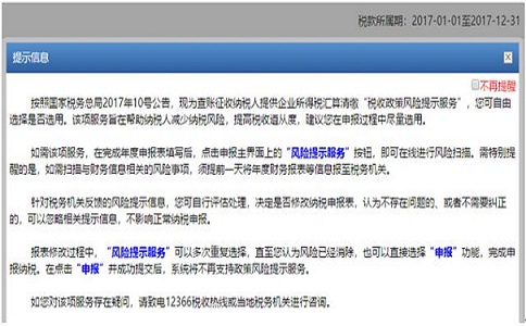 1、 您在申報頁面點擊“所得稅年度A類申報”后,系統將給出風險提示服務相關提示語。