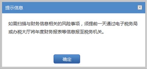 3、系統將首先給出前置條件提示信息:如需掃描與財務信息相關的風險事項,須提前一天將年度財務報表等信息報至稅務機關。