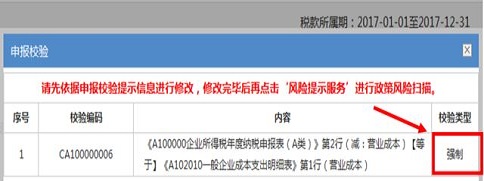 4、點擊*三步提示框中的“確定”按鈕后如果跳出申報強制校驗信息,請您先依據申報校驗提示信息進行修改,修改完畢后可再次點擊“風險提示服務”,系統將為您進行政策風險掃描。