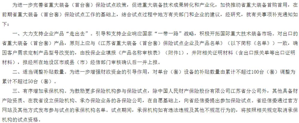 (3)首臺套保險試點項目:支持具有自主知識產權、附加值高、市場前景廣、帶動性強的省重大裝備(首臺套)突破市場推廣應用初期的瓶頸。